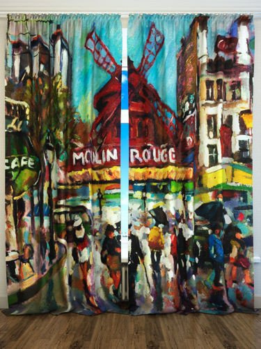 Zasłona "Paryż Mouline Rouge" przedstawia kolorową uliczną scenę z berlińskim Moulin Rouge jako centralnym elementem. Widoczne są różne budynki, kawiarniany szyld oraz liczne postacie, które wydają się być pieszymi na ulicy. Styl dzieła jest impresjonistyczny, z szerokimi pociągnięciami pędzla i żywymi kolorami, co nadaje mu żywiołowy i dynamiczny charakter.
