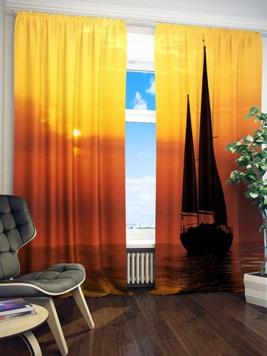 Głównym motywem zasłony jest żaglowiec unoszący swe żagle na horyzoncie morza. Delikatne odcienie błękitu i szarości tworzą tło, na którym kontury żaglowca wydają się tańczyć na falach. W oddali, nad horyzontem, słońce maluje niebo w odcienie ciepłej pomarańczy, złota i różu, tworząc niezwykłą grę świateł i cieni.