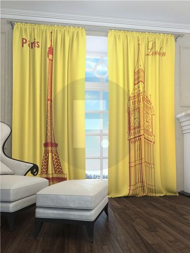 Ich mocowanie za pomocą taśmy i haczyków sprawia, że są łatwe w instalacji i utrzymaniu. Zasłony prezentują się w kolorze żółtym, a na nich widnieje grafika przedstawiająca Wieżę Eiffla i Big Ben oraz napis "Paris, London". Ta subtelna i stylowa grafika dodaje pomieszczeniu wyjątkowego uroku i może zainteresować osoby, które cenią dekoracje nawiązujące do podróży lub mają sentymentalne uczucia związane z tymi miastami.