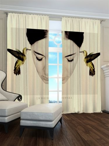 Jej kremowe tło stanowi subtelną, neutralną bazę, która idealnie komponuje się z różnorodnymi aranżacjami wnętrz. Głównym motywem zdobniczym są tu głowa kobiety i dwa kolibry, które wkomponowane są w delikatne wzory i subtelne detale. Ich obecność nadaje zasłonie niepowtarzalnego, mistycznego charakteru, jednocześnie wprowadzając do pomieszczenia nutę delikatności i harmonii.
