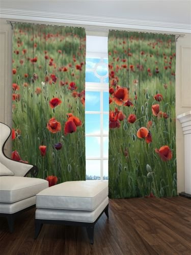 Głównym elementem dekoracyjnym zasłony są makowe pola, które w delikatny sposób zdobią materiał, tworząc przyjemny dla oka motyw. Kolorystyka zasłony jest stonowana, co pozwala łatwo dopasować ją do różnych stylów wnętrz, zarówno nowoczesnych, jak i klasycznych.