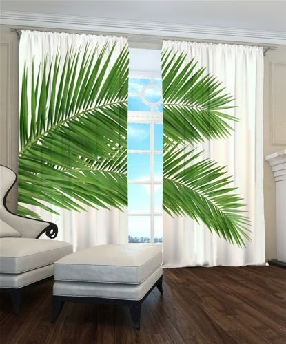 Głównym motywem zdobniczym zasłony są palmowe liście, które w subtelny sposób nadają jej egzotyczny charakter. Liście te są przedstawione w naturalistycznych detalach, co sprawia, że zasłona wygląda bardzo realistycznie i atrakcyjnie.