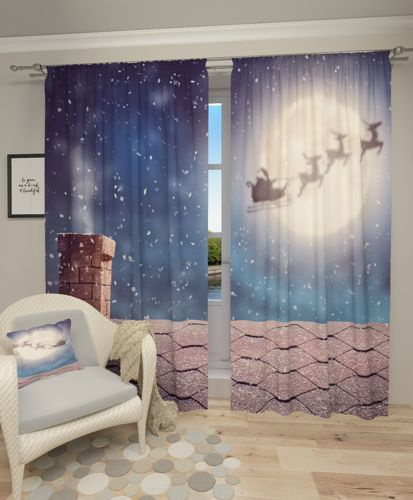 Zasłona wykonana jest z wysokiej jakości materiału, który gładko opada i pięknie się prezentuje. Motyw "Reniferowy zaprzęg" przenosi nas w scenerię zimowego krajobrazu, gdzie renifery ciągną sanie. Grafika jest starannie wykonana, co dodaje uroku i sprawia, że zasłona staje się centralnym elementem dekoracyjnym pomieszczenia.